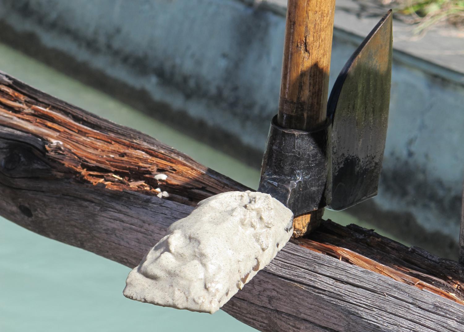 Mit der einen Seite des Wässerbeils wird die Wiesenscholle geschnitten, mit der anderen wird das "Wäschi" herausgeholt.