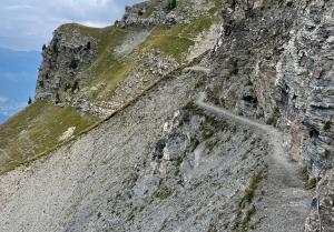 Wir besuchen wir die Spitze des Rhoneknies mit Blick auf das steil unter uns liegende Martigny. Gegenüber lachen majestätisch Mont Blanc und Grandes Jorasses. Nach langer Wanderung auf der schmalen Terrasse zwischen steilen Kalkfelsen erreichen wir auf dem Grat die Cabane de la Tourche.