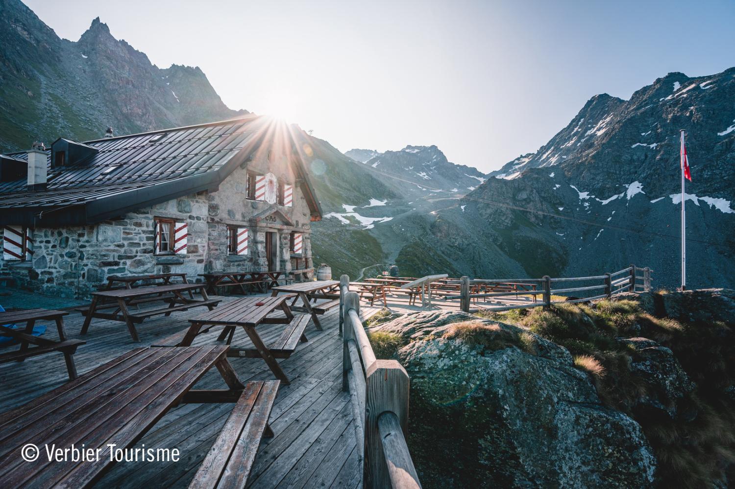 Die Königsetappe führt hinunter zum Lac de Mauvoisin und steigt dann hoch zum Col des Otanes. Die Cabane de Panossière liegt spektakulär gegenüber den Gletschern und vermittelt einen atemberaubenden Blick auf den Grand Combin.